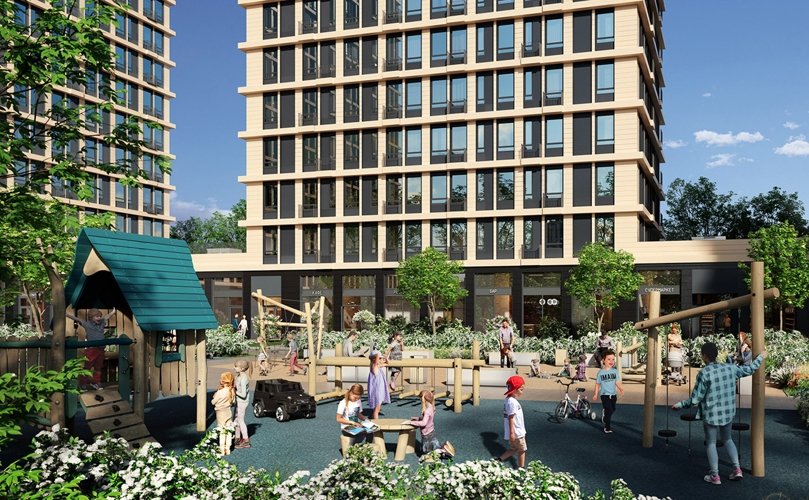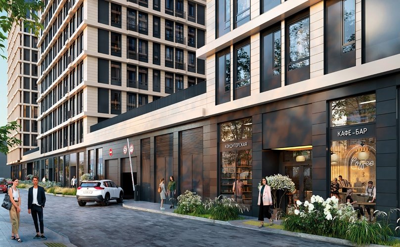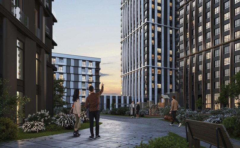 Архитекторы предложили концепцию, сочетающую динамичность высоток и уют приватного пространства. Здания разной высоты образуют внутренний двор, защищенный от городского шума и суеты. Зеленые зоны отделены от оживленной пешеходной улицы с магазинами, кафе и кофейнями.