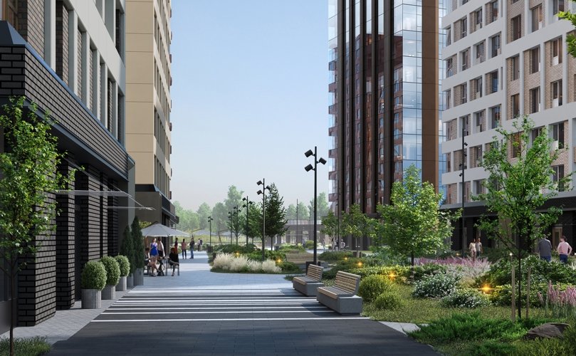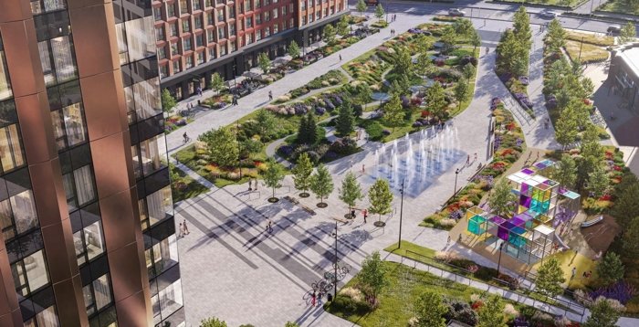 Это место привлекает всех жителей района. Здесь есть прогулочные дорожки и уютные лаундж-площадки на свежем воздухе. Летом работает сухой фонтан, а зимой — новогодняя елка на событийной площади.